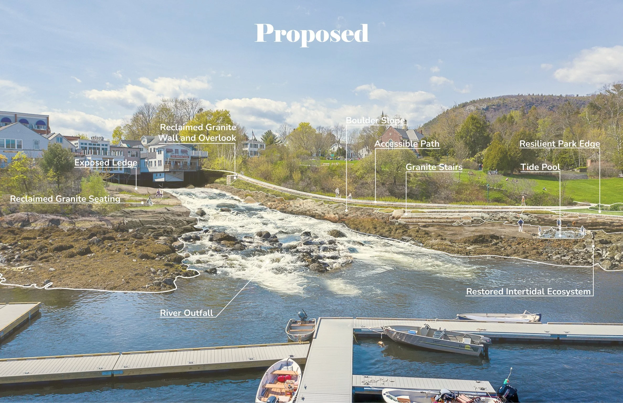 Next week, on Tuesday June 10, voters in Camden have an opportunity to show support for nature and our local rivers by voting YES on Article 7. Article 7 authorizes the Town of Camden to “Free the Megunticook River” and remove the relict Montgomery Dam in Harbor Park. When the dam, a short human-made wall atop the falls, is removed, the Megunticook River and falls will still cascade into Camden Harbor as depicted above. You can review the full sample ballot and language by clicking here.