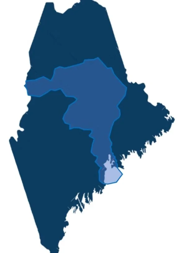 The Penobscot Bay watershed includes the ~8,900 square miles of land that drains into Penobscot Bay, as well as the Bay itself, which encompasses an estimated 1,070 square miles and includes approximately 1,700 islands, rock, and ledges. The Bay is shaped like an elongated triangle and is over 45 miles wide at its mouth and 37 miles long. The West Branch of the Penobscot River rises near Penobscot Lake on the Maine/Quebec border; the East Branch of the Penobscot River begins at East Branch Pond near the headwaters of the Allagash River. The Penobscot Bay drainage includes the Penobscot River, Bagaduce River, Passagassawakeag River, Weskeag River, Goose River, Ducktrap River, Megunticook River and Little River watersheds.
